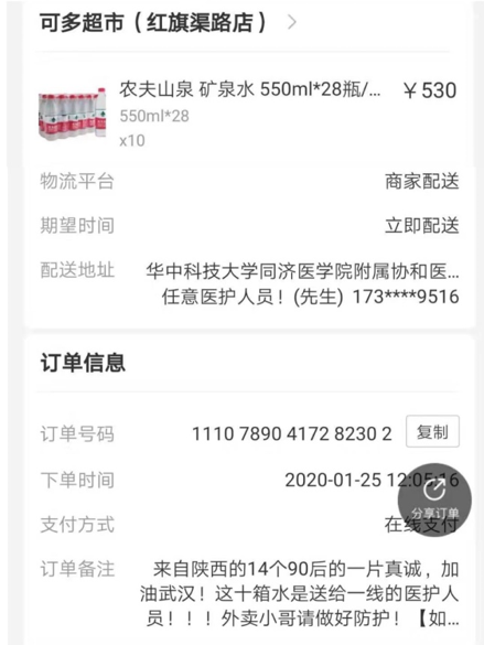 1月23日,疫情蔓延呈上漲趨勢,武漢“封城”后物資匱乏,各地各鎮(zhèn)府人民紛紛送去了物資力量,中陜核集團(tuán)核昌黨委工作部幾位青年們亦立即行動(dòng)起來,通過朋友圈、微信群、QQ群等渠道,組織號召朋友、家人參與進(jìn)來,開展捐款購買礦泉水活動(dòng),送往武漢華中科技大學(xué)同濟(jì)醫(yī)學(xué)院附屬協(xié)和醫(yī)院金銀湖分院,大家快速行動(dòng),活動(dòng)共捐助10280瓶礦泉水。小小的280瓶,帶著核昌青年及家人朋友對武漢同胞的祝福、對全體一線奮戰(zhàn)醫(yī)務(wù)人員的敬意、對國家抗擊疫情成功的信心前去抗疫一線,這份小小的力量有我們大大的祝福,希望能幫到他們,盼望正在一線奮斗患者和醫(yī)務(wù)人員都能平安歸來。